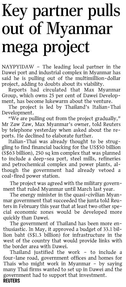 Key partner pulls out of Myanmar mega project